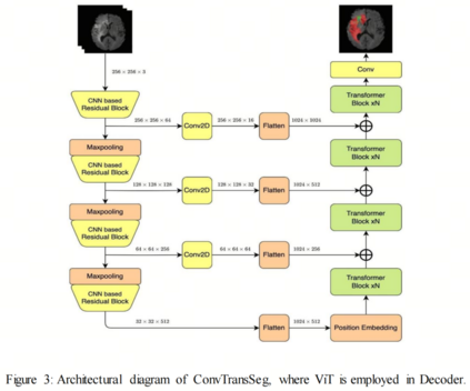 一些编码器-解码器技术只在其解码部分将ViT集成,以准确预测分割图像。由于全局上下文对于预测边界完美的分割掩码和区分背景和感兴趣的目标非常重要,因此MHSA在解码阶段对于这种目标非常有利。ConvTransSeg使用基于CNN的编码器进行特征学习,并使用ViT基解码器,在多个阶段链接。ConvTransSeg在二分类和多分类分割问题上显示出优越的结果,包括皮肤病变、息肉、细胞和脑组织。