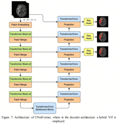 为了在解码阶段利用Hybrid ViT的优势,近年来研究将HVT集成到解码器架构中。最近一项研究提出了一种统一的框架UNetFormer,在编码侧使用3D Swin Transformer,在解码侧使用CNN和Transformer的组合。