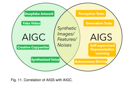 伴随着ChatGPT和Stable Diffusion的出现,AIGC的研究主题变得前所未有地受欢迎。AIGS与AIGC有强烈的相关性,因为它们都使用深度学习技术来生成新颖的内容。它们共同拥有的合成产品包括合成图像、合成特征[83]和合成噪声[203]等。 尽管如此,AIGS的设计目的是使用这些合成产品作为下游应用的数据源,重点是计算机视觉任务,而AIGC旨在生产更广泛的创意作品,包括但不限于视觉内容、文本内容、音频内容等。他们之间的相关性可以从图11中详细查看。