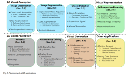作为一个相对新的机器学习范式,AIGS已经赋予计算机视觉中的各种下游任务新的能力。在本节中,我们将深入研究与AIGS相关的那些应用。尤其是,我们将关注以下五个子类:(1) 2D视觉感知任务,包括图像分类(第3.1节)、图像分割(第3.2节)和物体检测(第3.3节),其中这三个任务迄今为止占据了AIGS应用的绝大部分;(2) 视觉生成任务(第3.4节),我们探讨在训练生成模型而非判别模型时如何使用合成图像;(3) 自我监督学习任务(第3.5节),我们关注合成图像如何使视觉表示学习者变得更强大;(4) 3D视觉感知任务,包括在机器人技术(第3.6节)和自动驾驶(第3.7节)领域的应用,我们将检查在建模复杂的3D场景时合成图像如何传递3D感知信息;(5) 其他应用(第3.8节),我们将研究如何在一些特定的场景中,如医学和测试数据合成,应用AIGS范式。详细的分类呈现在图7中。