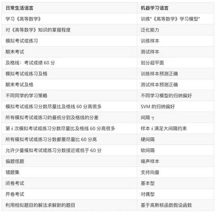 下表对 SVM 中涉及的一些概念用学习《高等数学》课程的例子进行类比,类比不见得严谨,但是有助于理解概念。我们学习机器学习还有一个意义是促进人类的学习,SVM 中的很多思想和策略对人类学习很有启发价值。