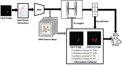 合成孔径雷达 (SAR) 图像通常用于军事应用中的自动目标识别 (ATR)。机器学习(ML)方法,如卷积神经网络(CNN)和图神经网络(GNN),经常用于识别地面目标,包括作战坦克、运兵车和导弹发射器。确定车辆类别(如 BRDM2 坦克、BMP2 坦克、BTR60 坦克和 BTR70 坦克)至关重要,因为这有助于确定目标对象是盟军还是敌军。虽然多重参照算法能提供识别目标的反馈信息,但最终决定权还在指挥官手中。因此,在识别目标的同时提供详细信息会对他们的行动产生重大影响。详细信息包括有助于分类的合成孔径雷达图像特征、分类置信度以及所识别目标被归类为不同目标类型或类别的概率。本文了提出了一种基于 GNN 的 ATR 框架,可提供最终分类类别并输出上述详细信息。这是首次对分类类别进行详细分析的研究,从而使最终决策更加简单明了。此外,在 MSTAR 数据集上进行评估时,GNN 框架达到了 99.2% 的整体准确率,比之前最先进的 GNN 方法有所提高。