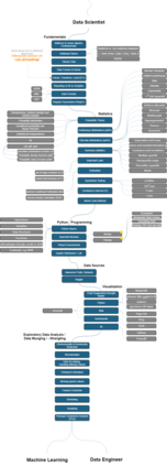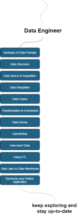 在数据科学家路线图之后可以直接进入到数据工程师路线图,这是第 2 条可选择的学习路径。该路线图主要介绍了数据格式、数据发现、数据集成、数据融合、数据调研、数据湖和数据仓库以及如何使用 ETL 等多方面内容。