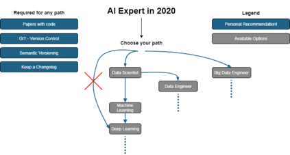 就这份 AI 专家路线图而言,开发者列出了任何学习路径所必不可少的一些要素,如论文和代码、版本控制、语义化版本控制和更新日志。但就具体选择上,开发者认为在学习 AI 时不应直接过渡到当前热门的技术——深度学习,而应步步为营,并提供了 3 条可供选择的学习路径:数据科学家→机器学习→深度学习…;数据科学家→数据工程师…;大数据工程师→…