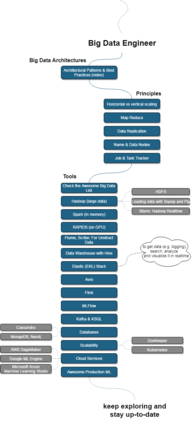 大数据工程师路线图是第 3 条可选择的学习路径,主要分为 3 部分内容:大数据架构、遵循的原则以及所用工具。大数据架构部分主要讲述了大数据分析架构模式和最佳实践;遵循的原则包括数据库管理系统中的数据复制,以及 Hadoop 中 NameNode 和 DataNode 的区别等;所用工具则介绍了 Hadoop、Spark 等。