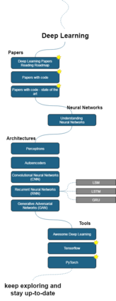 机器学习之后进入到了深度学习,这是第 1 条可选择学习路径的最后部分。深度学习路线图由 4 大部分组成:论文、神经网络、网络架构以及所用工具。论文部分提供了深度学习论文阅读路线图以及 SOTA 论文;神经网络部分提供了一篇详细介绍如何理解神经网络的博客文章;网络架构部分包括感知器、自动编码器、CNN、RNN;所用工具部分主要介绍了 TensorFlow 、PyTorch 等。最后给出建议:保持探索、与时俱进。