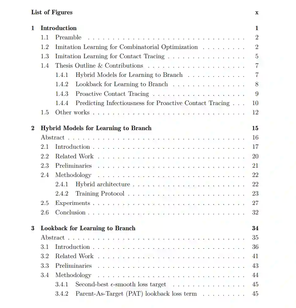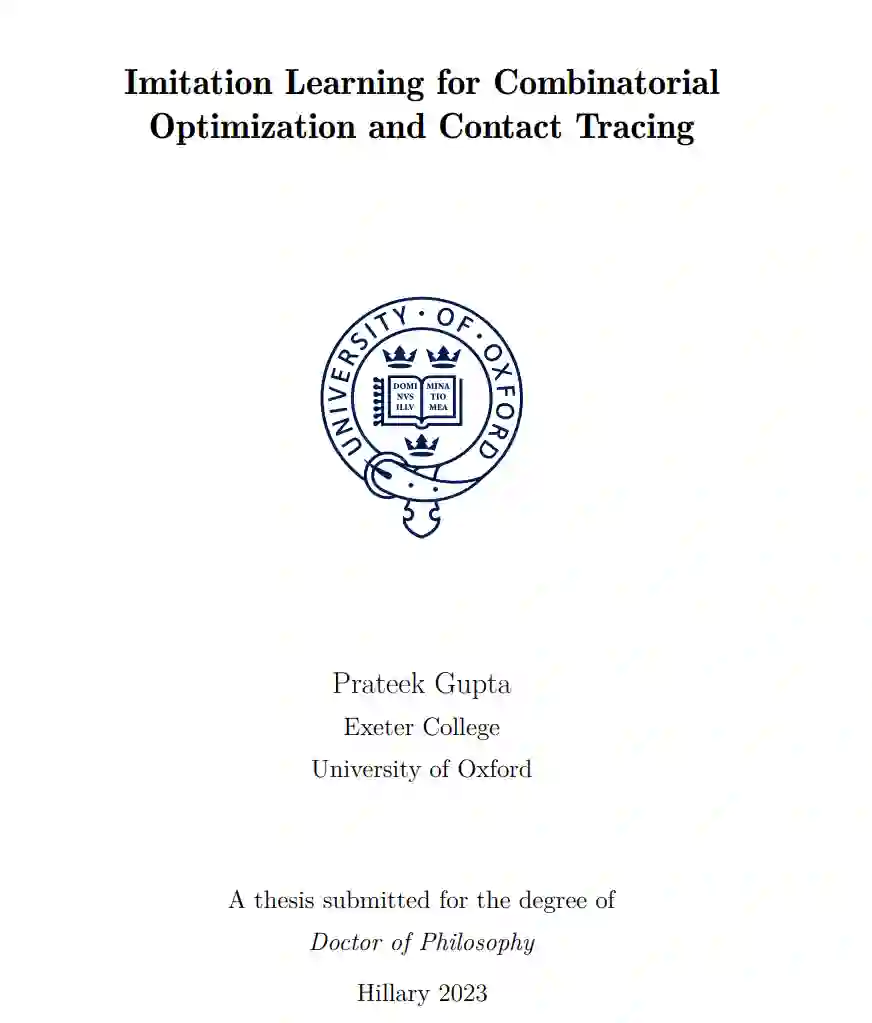 在近年来,模仿学习(IL)领域取得了显著进展,研究人员已将这种机器学习技术应用于机器人学、自动驾驶汽车、医疗保健和游戏玩法等多个领域。每个领域都通过开发和应用新方法解决特定于其领域的独特问题,为该领域的进步做出了贡献。在本论文中,我们重点关注在两个具有独特挑战的领域中的IL应用。 第一个应用涉及学习模仿混合整数线性规划(MILP)求解器的高精度启发式算法,尽管准确,但由于计算效率低下而不实用。第二个应用涉及开发一个IL框架,通过使用新开发的主动接触追踪(PCT)框架,通过智能手机应用准确预测个体的传染性,克服了传统接触追踪方法的限制。