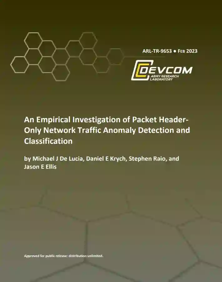 研究重点是在资源有限的环境中,如战术边缘,尽量减少训练和预测时间。在Wang等人的研究中,作者从传输控制协议(TCP)会话有效载荷或所有层中选择了784个字节,并将这些字节转换为28×28的灰度图像,使用这个特征集来训练LeNet-5(即图像)启发分类器。Zeng等人使用代表为30×30灰度图像的900个字节作为他们的特征集来训练他们的分类器,该分类器由三个并行架构组成--一个堆叠的自动编码器(AE)、一个两层1D-CN和一个长短期记忆(LSTM)分类器。然而,向某些领域转换的额外步骤会增加计算时间的开销,并有可能造成信息损失。我们承认,由于在其他领域有最先进的算法,数据的领域转换有可能导致更好的模型表现。这些最先进的算法可能能够使用不同的视角来识别相同数据中的不同模式。然而,数据转换可能会增加分类/检测决策的计算开销,可能会因为对原始数据的误解或误报而造成进一步的信息损失,并且可能会增加对特征集的大小或使用的特征类型的限制。因此,为了确保我们不引入任何不必要的计算开销或限制,并采用一种在现实世界中切实可行的方法,即加密的有效载荷是常态,我们将我们的网络异常检测和二元分类模型的特征限制在只有原始形式的数据包头字段(TCP/互联网协议[IP]),而不使用历史信息,如网络流量统计或数据包间特征。我们使用这些网络头字段而不进行域转换,期望它能更有效地利用资源,并防止在域转换过程中对原始数据的任何潜在误解或误报。