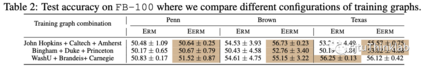 对于Facebook数据集,我们考虑使用多个图进行训练。具体的,我们考虑三种训练子图的组合。下表显示了使用不同训练子图的组合,在三个测试图(Penn,Brown,Texas)上的准确率对比。同样,EERM在绝大部分情况下超越了ERM,取得了最高7.2%的提升。