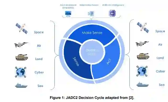 “联合全域指挥控制”(JADC2)代表一种复杂的决策模式,旨在快速整合全域作战能力以获取“竞争”与“冲突”场景中的战略优势[1]。根据文献[2]阐述,JADC2涵盖“感知”“研判”“行动”三大核心功能,贯穿“太空”“网络”“空中”“陆地”及“海洋”五大作战域[3]。该系统依托由先进传感技术构成的“多域传感体系”,包含“光电/红外成像”“高光谱成像”“雷达(无源/有源)”“声学传感器”及“侦察卫星”等设备。跨域数据流生成分布于不同时空维度的海量信息。“有效管理”这些数据对支持“作战管理”与“指挥决策”至关重要,需确保“精准情报”及时送达相应团队或“智能体”以实现预期作战效果。此类“数据点”要求构建统一的“多域网络”——通过整合“多源信息”(取代孤立数据管道)形成“全域联合态势感知图景”。这种“集成化路径”有助于“全面把握作战环境”。如图1所示,应用“机器学习”“人工智能”与“预测分析”能进一步优化该流程,提供“数据融合”与“快速解析”的高级能力,将感知图景转化为作战行动[2][3]。文献[4]强调,“指挥控制”的根本目标是确保“精准情报”及时交付相应决策者,从而彰显“敏捷性”并促进团队间“互操作性”。实现此目标需依托“量子通信”“人工智能(AI)”及“自主系统”等关键技术。未来JADC2将构筑“类云环境”,实现“情报共享”“态势监视”及“高速数据通信”以加速决策[2]至[5]。这些技术以远超人类的“处理速度”与“规模”实现数据快速解析。文献[4]着重指出“AI”与“机器学习(ML)”在自动化处理海量信息、支持决策流程中的整合作用。二者特别擅长在“动态多变量环境”中识别快速演变的“模式特征”,通过关联“地形”“气象”“行为模式”等离散情报源预判态势并响应环境变化[2]至[5]。在“未来指挥控制系统”中,AI有望跨“梯队”“作战域”及“作战资产”同步多重行动,从而把握“关键战机窗口”。此项能力在“无人地面载具(UGV)”“无人机(UAV)”“水下潜航器(UUV)”“水面艇(USV)”等搭载智能传感器的作战平台日益普及的战场尤为重要。AI赋能的系统可评估作战环境中“多源情报”,运用“历史数据”生成行动建议,从而减轻“认知负荷”并赋能指挥官的“快速有效决策”。