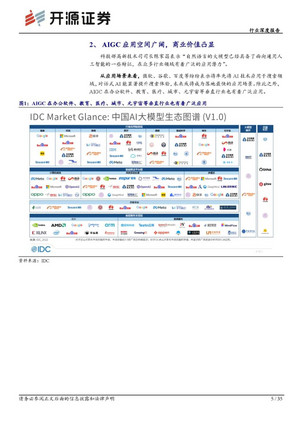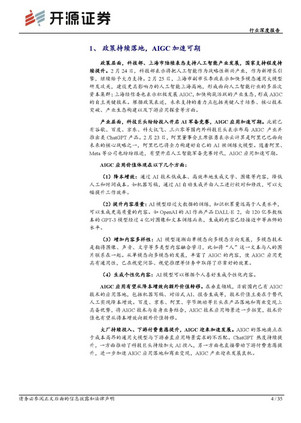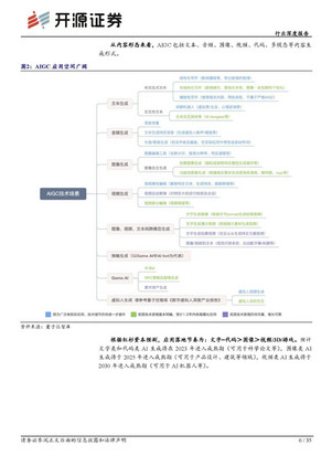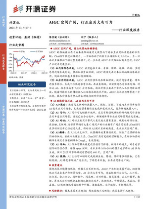 AIGC的落地痛点在于成本高昂的通用大模型与下游垂直应用场景需求的不匹配。ChatGPT热度持续提升,一方面推动了科技巨头持续加大AI投入,另一方面也直接带动下游付费意愿提升,进一步加速AIGC应用落地和商业变现,AIGC产业迎来发展良机。 (1)从内容形态来看,AIGC应用包括文本、音频、图像、视频、代码、多模态等内容生成形式,根据红衫资本预测,AIGC将首先在文本和代码领域落地应用,随后逐渐拓展至图像和视频领域。 (2)从应用价值来看,AIGC应用价值体现在降本增效、提升内容质量、增加内容多样性、生成个性化内容等方面。在垂直领域,目前国内已有机器写稿、对话式AI、报告生成等AIGC应用落地,技术价值主要在于替代人工实现降本增效。随着科技巨头的持续投入以及技术的迭代升级,AIGC技术应用场景进一步拓宽,技术价值也有望从将本增效向额外价值转移。 AI赋能价值凸显,AI应用大有可为 (1)AI+搜索:搜索是互联网的流量入口,微软、谷歌、百度均表示将率先将AI技术应用于搜索,未来有望重塑信息生成和呈现方式,成为新的流量入口。 (2)AI写作:AI写作可大幅提升效率,在具有较强规律性的结构化写作方面具有丰富应用场景。目前已在办公软件、新闻媒体等专业应用场景商业化落地。 (3)AI对话:AI对话主要用于替代人类完成大量重复性、规则性对话任务,在金融、互联网、运营商等拥有大量C端用户的行业拥有广阔应用前景。ChatGPT在多项测试中已经超过人类,将对话AI提升至新的高度,未来应用空间广阔。 (4)AI翻译:在AI技术支持下,机器翻译效果持续优化,但在广义理解层面仍面临挑战。相比专业搜索工具,ChatGPT具有更强的理解能力,在部分场景的翻译表现优于谷歌翻译和DeepL,表现惊艳。 (5)AI作画:AI作画可解决视觉内容创作门槛高、耗时长的痛点,对于内容创作的价值凸显。根据6pen预测,未来五年10%-30%的图片内容将由AI参与生成,预计2027年市场规模有望超过600亿,空间广阔。 (6)AI视频:AI已经可以辅助完成视频生成、替换、剪辑等多项任务,已在短视频、AI修复等领域广发应用,下游需求旺盛,未来应用潜力广阔。