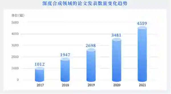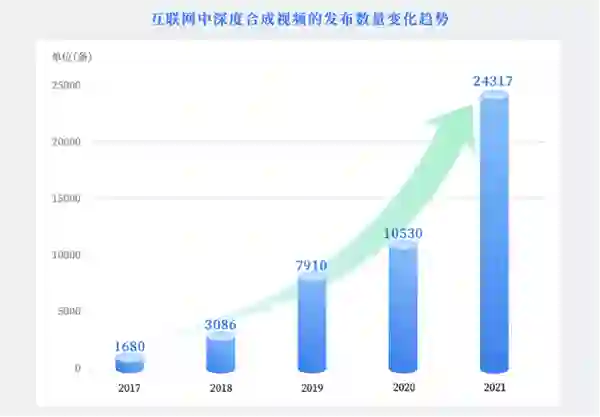 以视频为例,《报告》显示,在国内外主流音视频网站、社交媒体平台上,2021年新发布的深度合成视频的数量较2017年已增长10倍以上。此外,深度合成内容关注度也呈指数级增长,通过对互动数据进行统计,2021年新发布的深度合成视频的点赞数已超过3亿。