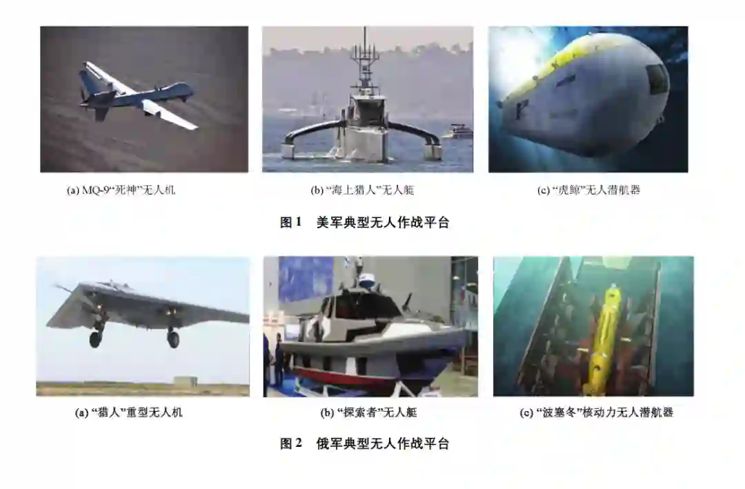 介绍了无人作战平台萌芽起步、探索改进和蓬勃发展三个阶段的发展历程,阐述了无人作 战平台侦察预警、指挥控制、综合打击、作战评估和联合保障五个方面的作战特点,从作战任务、作 战方式、作战模式和作战战法四个方面总结了无人作战平台的作战应用,重点梳理了无人作战平台 建设在战场态势感知、通信、协同控制以及推进与动力四个方面的技术难点,在此基础上,从装备构 成、功能设计和作战运用三个方面对无人作战平台的发展趋势进行了展望。无人作战平台是指具备无人驾驶能力、能够完 全按遥控操作或按预编程序自主运作、且可携带进 攻性或防御性武器遂行作战任务的一类武器平台。从组成要素看,无人作战平台主要包括空中无人作 战平台、地面无人作战平台、水面/水下无人作战平 台和太空无人作战平台; 从装备构成看,无人作战平 台主要包括无人机、无人战车、无人舰艇、无人潜航 器以及无人轨道飞行器等[1 - 2]。目前,无人作战平 台已在美国、俄罗斯等军事强国多场局部战争和反 恐行动中发挥了至关重要的作用。未来,随着人工 智能、大数据、物联网、云计算等高新技术的快速发 展和深入应用,战争形态将逐步由信息化向智能化 加速演进,因此,基于网络信息体系智能化条件下的无人作战将取代传统作战样式,无人作战平台也将 取代有人作战平台成为未来战场的主要作战力量。同时,科学技术的发展也促进了无人作战基本概念、 技术支撑和制胜机理等理论层面的不断突破,与之 对应的无人作战平台将成为未来世界各军事大国竞 相角逐的主要领域。
