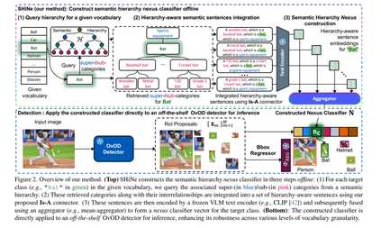 开放词汇目标检测(OvOD)将检测转变为一个由语言引导的任务,使用户能够在推理过程中自由定义他们感兴趣的类别词汇。然而,我们的初步研究表明,现有的OvOD检测器在处理不同语义粒度的词汇时表现出显著的差异性,这对实际应用提出了挑战。为此,我们引入了语义层次枢纽(Semantic Hierarchy Nexus,SHiNe),这是一种利用类层次语义知识的新型分类器。它通过三个步骤离线运行: i) 从层次结构中检索每个目标类别的相关上位/下位类别; ii) 将这些类别整合成层次感知句子; iii) 融合这些句子嵌入生成枢纽分类器向量。我们在各种检测基准上的评估表明,SHiNe增强了跨不同词汇粒度的鲁棒性,在使用真实层次结构时实现了高达+31.9%的mAP50提升,同时在使用大语言模型生成的层次结构时也保持了改进。此外,应用于ImageNet-1k的开放词汇分类时,SHiNe将CLIP零样本基线提升了+2.8%的准确率。SHiNe无需训练,可以无缝集成到任何现成的OvOD检测器中,并且在推理过程中不会增加额外的计算开销。代码是开源的。 https://arxiv.org/abs/2405.10053