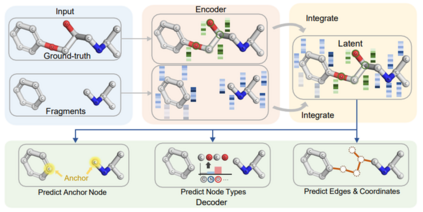 在药物研发中,由于搜索空间的离散性和庞大性,设计包含所需药效团特性的新分子药物仍具有挑战性。近期,一种独特的药物分子将两个具有生物功能的片段分子与接头分子相结合,进而表现出分子接合策略的巨大应用潜力。然而,该策略中的关键点是分子连接器的设计,目前此过程仍依赖于专业的结构生物学家,因此需要一种有效的深度学习方法来解决该问题。 如图1,分子连接器的生成问题可定义为:给定两个具有坐标信息的分子片段图,生成一个包含坐标信息的连接图,用于拼接上述两个片段。同时,生成的连接图坐标需要在空间中与片段相对齐。