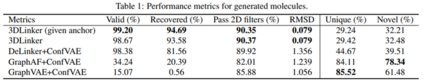 作者选择ZINC数据集作为分子结构来源,从中提取有效的分子片段与连接器信息,并使用RDKit来生成分子的真实三维坐标信息。实验结果表明,3DLinker模型在预测的有效性,恢复率(即描述生成分子与真实分子的恢复比例),2D属性通过率(即合成可及性、环芳香性和泛分析干扰化合物属性),RMSD(即生成分子与真实分子在结构坐标上的差异)指标上,均表现出优秀的性能。