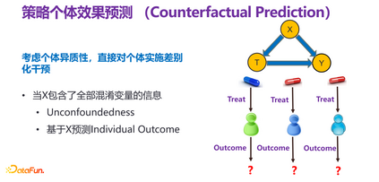 (2)现有方法的局限 策略个体效果预测常用的方法是直接对个体进行预测建模,也就是基于历史观测数据图片,然后训练得到反事实预测模型图片,即给定了 X 和 T,能比较合理和准确地预测实际效果 y 是怎样的。