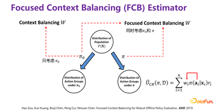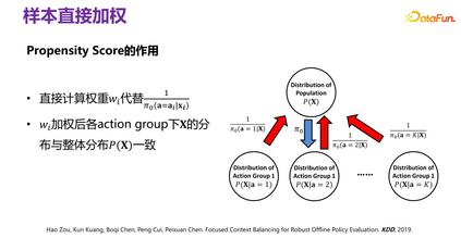 借鉴因果关系(Causality)的直接混淆变量平衡(directly confounder balancing),提出了对样本直接加权的方法,使得加权后,可以保证在各个对应行为群(action group)的分布 P(X|ai)整体上和 P(X) 是一致的。 历史数据是在给定 Π0 的情况下产生的,要去掉因 Π0 引起的分布偏差(bias),具体做法如上图所示,原始的数据分布 P(X),在 Π0 的作用下,相当于把 P(X) 划分为若干个子分布 P(X|a=1)、P(X|a=2)、P(X|a=3)、...、P(X|a=K),即不同的行为下对应 P(X) 的一个子集,是无偏的分布,每个行为群下都有因 Π0 而引起的偏差,要去掉偏差,可以通过对经 Π0 而产生的历史数据进行重加权,使得加权以后的所有子分布,都逼近原始分布 P(X),即样本直接加权。 预测一个新的策略在历史数据的前提下最终的效果会是什么样的,需要分两步进行。第一步,就是如前所述,先通过样本直接加权的方式去掉原始策略 Π0 所带来的偏差。第二步,要预测新策略 Π 的效果,也就是在新策略 Π 引起的偏差下去预估最终的效果,所以需要加上新策略 Π 引起的偏差 。