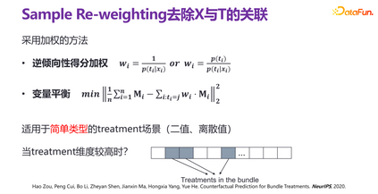 传统做法是采用样本重加权(Sample Re-weighting)的方法来去除 X 和 T 之间的关联,有两种方法:(1)逆倾向性得分加权,(2)变量平衡。但这些方法都存在局限性:只适用于简单类型的干预变量(treatment)场景,二值或离散值。在真实的应用场景下,比如推荐系统,干预变量(treatment)维度很高,给用户推荐商品,推荐的是一个束(bundle),即从很多商品中进行推荐。当干预变量(treatment)维度很高时,使用传统的方法,把初始干预变量(raw treatment)和混淆变量(confounder) X 直接去关联,复杂度非常高,甚至样本空间不足够来去支撑高维度的干预变量(treatment)。