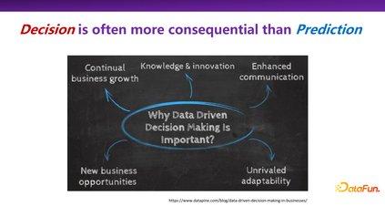 在实际的很多场景中,决策比预测更加重要。因为预测本身的目的并不只是单纯地预知未来长什么样子,而是希望通过预测去影响当下的一些关键行为和决策。 在很多领域,包括商业社会学领域,做决策非常重要,比如持续的业务增长(Continual business growth)、新商业机会发现(New business opportunity)等,如何通过数据驱动来更好地支撑最终的决策,是人工智能领域不可忽视的一部分工作。