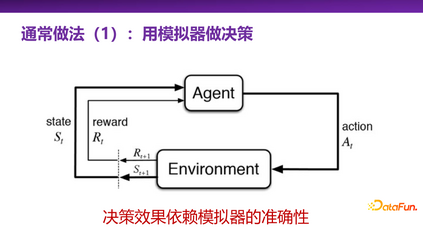 第一种通常做法是用模拟器做决策,即强化学习(reinforcement learning)。强化学习是非常强大的一类做决策的方法体系,相当于有一个真实场景(environment),或者有一个对真实场景的模拟,就可以通过智能代理(agent)不断和真实场景进行试错学习,不断探索关键行为(action),最终找到在此真实场景中收益(reward)最大的关键行为。
