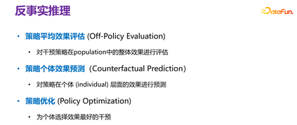 反事实推理有三个场景。 第一是策略平均效果评估(Off-Policy Evaluation)。对于一个给定的策略(policy),不希望进行 AB 测试,因为 AB 测试成本太高,因此在离线数据上评测该策略上线后,会有什么样的效果,就相当于对整个族群(population)或所有 sample 进行评测,比如对所有用户群体的一个整体效果评估。 第二是策略个体效果评估(Counterfactual Prediction),是对策略在一个个体层面的效果进行预测,不是整体平台性策略,而是针对某个个体进行一定的干预后,会有什么样的效果。 第三是策略优化(Policy Optimization),即怎么样去为一个个体选择效果最好的干预。和个体效果预测不一样,个体效果预测是先知道怎么干预,然后预测干预后的效果;策略优化是事先不知道怎么干预,但寻求怎样干预之后的效果最好。