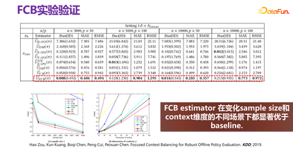 新方法 FCB Estimator 的最后提升效果如上图所示,提升效果非常明显,不管是从偏差(bias),还是 RMSE 的维度上来讲,相对提升大概有 15%-20%。FCB Estimator 在变化 sample size 和 context 维度的不同场景下都显著优于 baseline。相关论文发表在 KDD 2019 [2]。