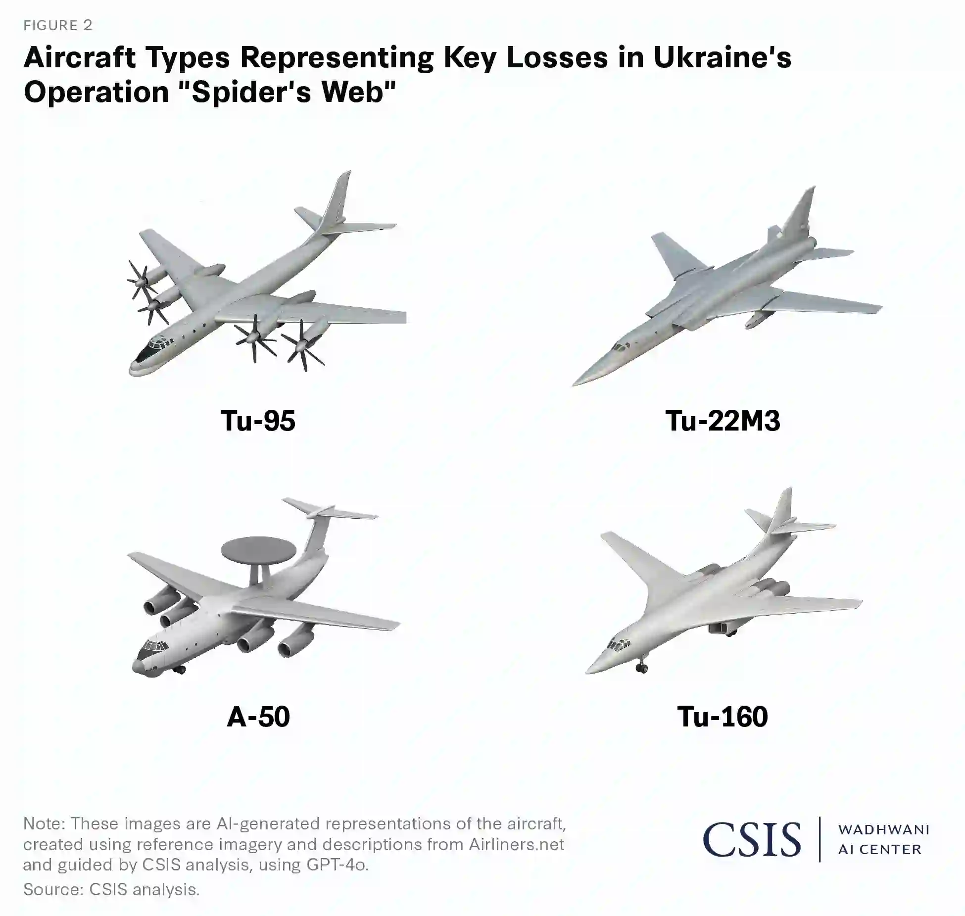 答:乌安全局"蛛网行动"摧毁俄境内四大基地超40架军机。如图2所示,主要战损涵盖战略轰炸机、战术航空器及预警指挥机三大类。