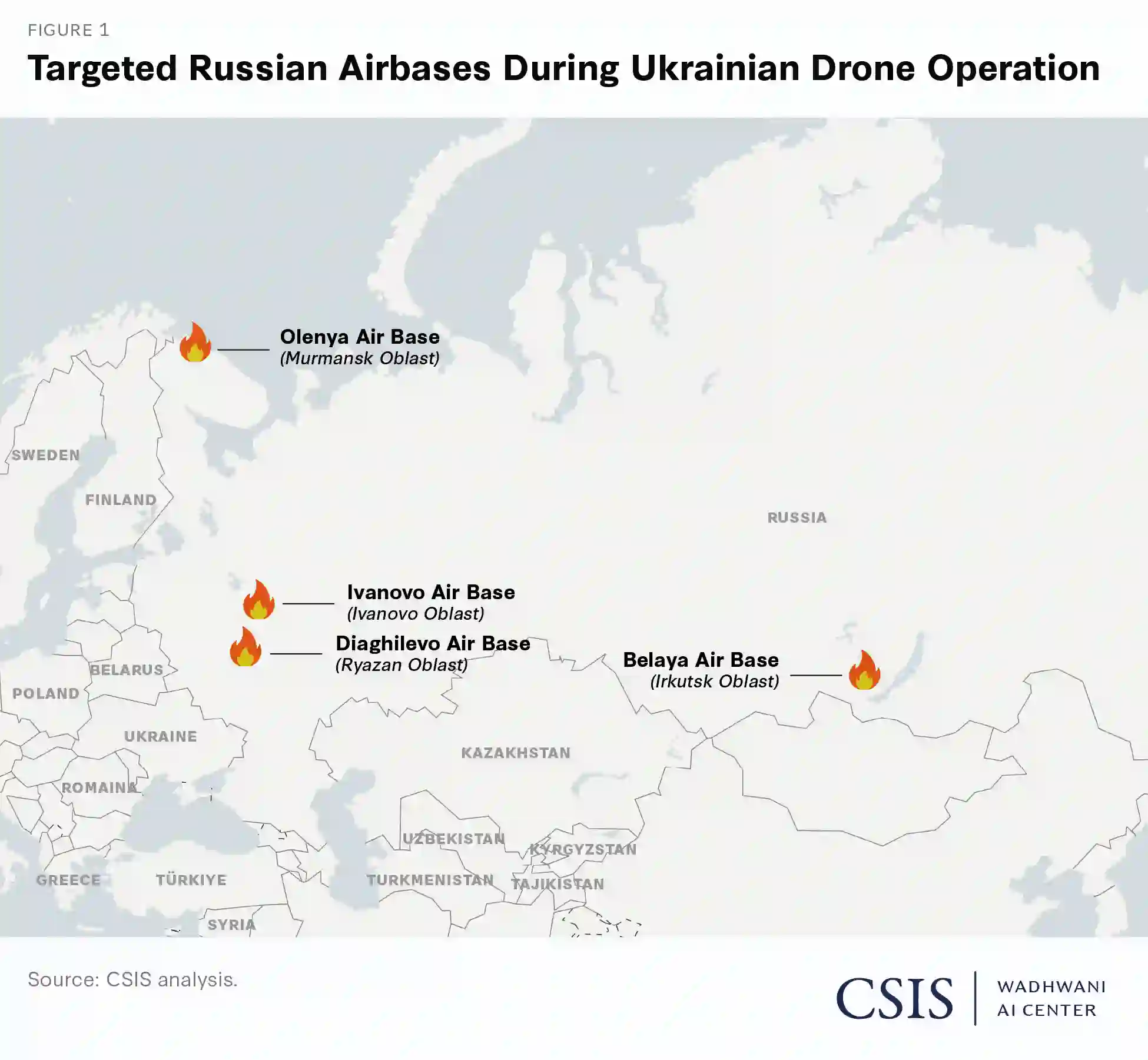 答:该行动锁定俄四大军用航空基地(俄战略航空力量关键设施)。如图1所示,其地理分布贯穿俄罗斯全境——这正是行动代号的灵感来源。