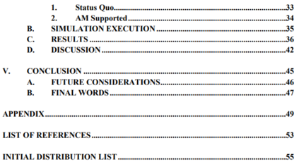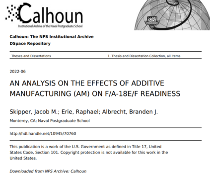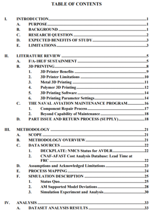 这篇研究论文重点关注波音F/A-18E和F/A-18F "超级大黄蜂 "航空库房级可修复(AVDLR)零件工艺以及增材制造(AM)对该工艺的潜在影响。研究的动机是由最近的报告所激发的,该报告表明F/A-18E/F正经历着作战准备的下降,因为与维修有关的影响增加了,与零件的可用性、长的交货时间和增加的零件故障频率有关。这项研究的目的是确定在中级维修过程中插入AM的要求,以便对F/A-18E/F的仓库级可维修部件的准备时间产生重大影响。更具体地说,这项研究分析了各种AM生产水平对整体交货时间的潜在影响。通过数学模型和基于各种假设和概率分布的模拟来促进这个研究项目的完成。进行了8次模拟,每次都有不同的AM生产时间假设。结果输出反映了19种不同的情况,模拟了0%-90%的AM在中级维护水平的生产。结果表明,如果AM生产能保持在大约30天以内,那么AM有可能减少整体预期交货时间的平均数。