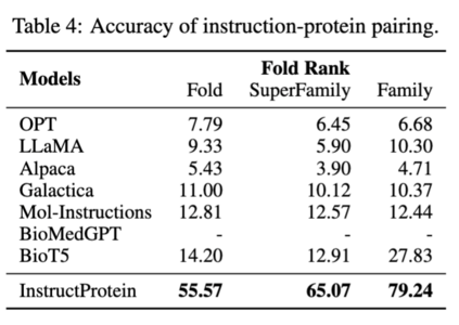在蛋白质设计方面,文章设计了一个“指令蛋白配对”任务:给定一个蛋白质及其描述,模型需要从其对应描述及九个不对应的描述中选择最合适的一项。在指令-蛋白质配对任务中,InstructProtein显著超越了所有基线模型,展现出其在指令跟随和蛋白质设计方面的优越性。BioMedGPT因只专注于将蛋白质转换为文本而缺乏蛋白质设计能力。Galactica由于其训练数据集是以叙述性蛋白质语料为主,因此在零样本任务中与指令对齐的性能有限。Mol-Instructions没有在蛋白质语料上进行预训练,难以分辨蛋白质的细微差异,导致性能不佳。这些结果验证了我们模型在遵循设计指令方面的出色能力,强调了针对特定任务进行预训练和数据集优化的重要性,以提升模型在蛋白质设计方面的性能。