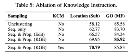 通过对数据集构建策略和知识因果建模进行的消融研究显示:在蛋白质位置预测等注释不平衡明显的任务中,相似蛋白质的聚类采样可以显著提高模型性能。在注释平衡的情况下(如GO任务),单纯基于序列的聚类可能降低了模型表现。通过同时考虑序列和性质的相似性可以避免这种下降。对于聚类方法,基于知识图谱嵌入距离的方法比编辑距离更能有效地捕捉性质相似性。引入的知识因果关系能够进一步提升模型性能。