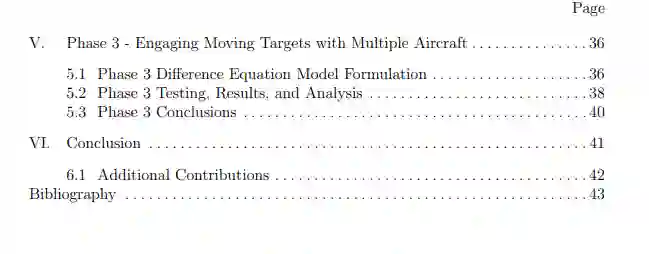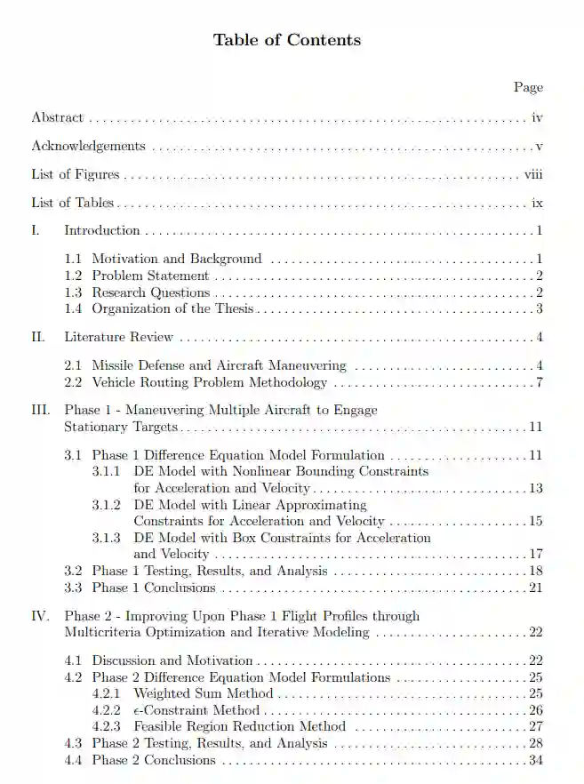 本论文的其余部分组织如下。第二章讨论了与国防、飞行器路由问题和涉及差分方程的数学编程公式有关的文献,以操纵或路由实体。下面的研究分三个不同阶段进行。第三章介绍了第一阶段所研究的工作,该阶段开发并测试了操纵多架航空器来对付静止目标的替代模型。在第四章中提出,第二阶段的研究探讨了替代的数学编程模型的增强,以创建研究第一阶段的可行的飞行轮廓。在第五章中,介绍了第三阶段研究的工作,其中开发和测试了一个最终模型,以操纵多架航空器来对付移动目标。第六章以工作的主要成果对论文进行了总结,并介绍了未来关于时空网络路由模型主题的可能研究途径。
