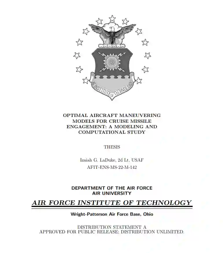 鉴于对手军事能力的威胁和扩散的增加,这项研究试图开发合理准确和可计算的模型,以最佳方式操纵航空器拦截巡航导弹攻击。该研究利用数学编程对问题进行建模,并以代表(时间)差分方程系统的约束条件为依据。研究首先比较了六个模型,这些模型对速度和加速度约束有不同的表述,同时分析了静止目标的情况。多航空器、多固定目标交战问题与箱体约束条件(MAMSTEP-BC)模型产生了卓越的整体性能,并通过替代数学编程模型的增强进行了进一步分析,以便在利用有效的机动序列方面创建可行的飞行轮廓。最后,对MAMSTEP-BC模型进行了修改,以操纵飞机来对付移动目标。