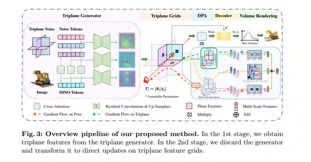 摘要:基于三平面的辐射场在近年来受到关注,因其能够有效解耦三维场景,同时提供高质量的表示和低计算成本。该方法的一项关键要求是精确输入相机姿态。然而,由于三平面的局部更新特性,类似于先前的联合姿态-神经辐射场优化工作的联合估计容易导致局部最小值。为此,我们提出了解耦三平面生成模块,以引入全局特征上下文和光滑性,减轻由局部更新引起的误差。随后,我们提出了解耦平面聚合,以缓解在相机姿态更新过程中由于常见三平面特征聚合而造成的纠缠。此外,我们引入了一种两阶段的热启动训练策略,以减少由三平面生成器引起的隐性约束。定量和定性结果表明,我们提出的方法在具有噪声或未知相机姿态的新视图合成中实现了最先进的性能,同时优化的收敛效率也得到了提升。项目页面:https://gaohchen.github.io/DiGARR/。关键词:NeRF · 解耦 · 姿态估计 · 新视图合成
