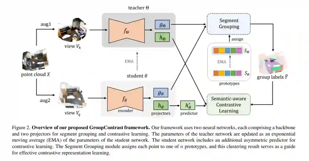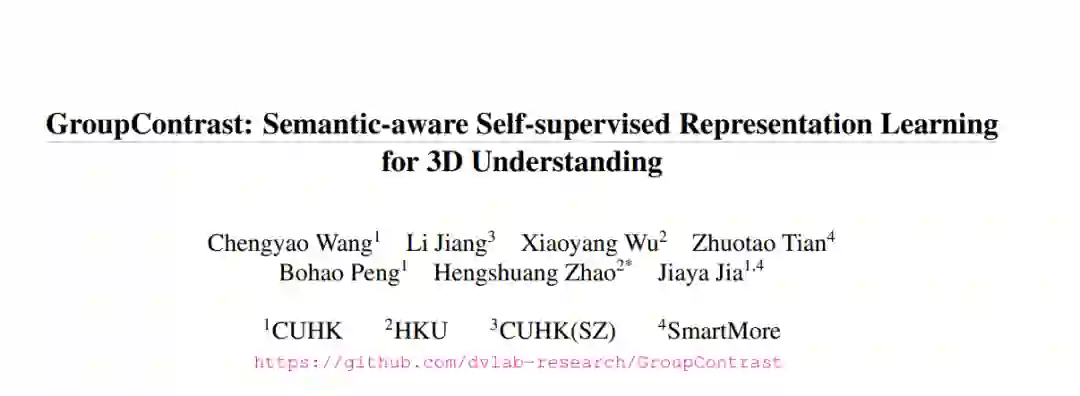 自监督三维表示学习旨在从大规模未标记点云中学习有效的表示。大多数现有方法采用点区分作为预文任务,将两个不同视图中匹配的点作为正对,不匹配的点作为负对。然而,这种方法经常导致语义上相同的点具有不相似的表示,从而产生大量的假负例并引入“语义冲突”问题。为了解决这个问题,我们提出了GroupContrast,一种结合段落分组和语义感知对比学习的新方法。段落分组将点划分为语义上有意义的区域,这增强了语义连贯性并为随后的对比表示学习提供了语义指导。语义感知对比学习增强了从段落分组中提取的语义信息,并有助于缓解“语义冲突”的问题。我们在多个三维场景理解任务上进行了广泛的实验。结果表明,GroupContrast学习到了语义上有意义的表示,并实现了有希望的迁移学习性能。