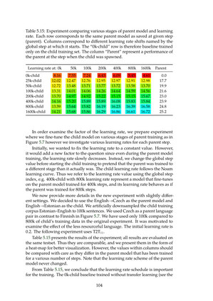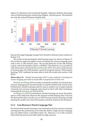Tom Kocmi的博士论文《Exploring Benefits of Transfer Learning in Neural Machine Translation》(《探索迁移学习在神经机器翻译中的益处》)提出相关的迁移学习技术,并提供了详细地分析。论文展示了几种利用基于大量资源语言对训练的模型来提升少量资源情况下的模型训练。在分析过程中,作者发现: