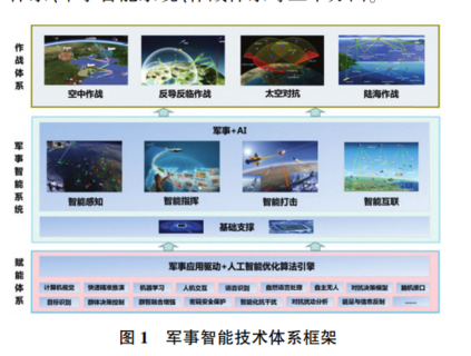 图 1 军事智能技术体系框架 赋能体系:以机器学习、人机交互、计算机视觉 等人工智能算法为依托,形成面向军事应用的人工 智能优化算法引擎,实现人工智能技术在军事领域 的赋能。军事智能系统:应用赋能技术,面向军事作战需 求,依托作为人工智能算法“倍增器” 的基础支撑, 实现感知、指挥、打击、互联形成的 OODA 作战链路 的智能化。作战体系:在空中作战、反导反临作战、太空对 抗、陆海作战等行动中,作战部队利用军事智能系 统,与人协同,提升作战效能,形成对敌方的非对称 优势。