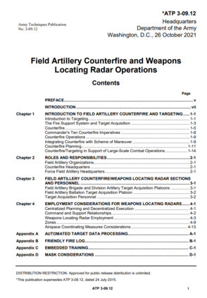 ATP 3-09.12分为四章和十一个附录。 第1章 野战炮兵反击和目标定位简介。 第2章 角色和责任。 第3章 野战炮兵反火力/武器定位雷达部门和人员。 第4章 武器定位雷达的使用考虑因素。 附录A 自动化目标数据处理。 附录B 友军射击日志。 附录C 嵌入式训练。 附录D 面具的考虑因素。 附录E 支持要求。 附录F 工具和程序。 附录G 火箭炮迫击炮(RAM)的警告。 附录H AN/TPQ-53武器定位雷达系统特性。 附录I AN/TPQ-50武器定位雷达系统特性。 附录J AN/TPQ-36武器定位雷达系统特性。 附录K 目标获取表。