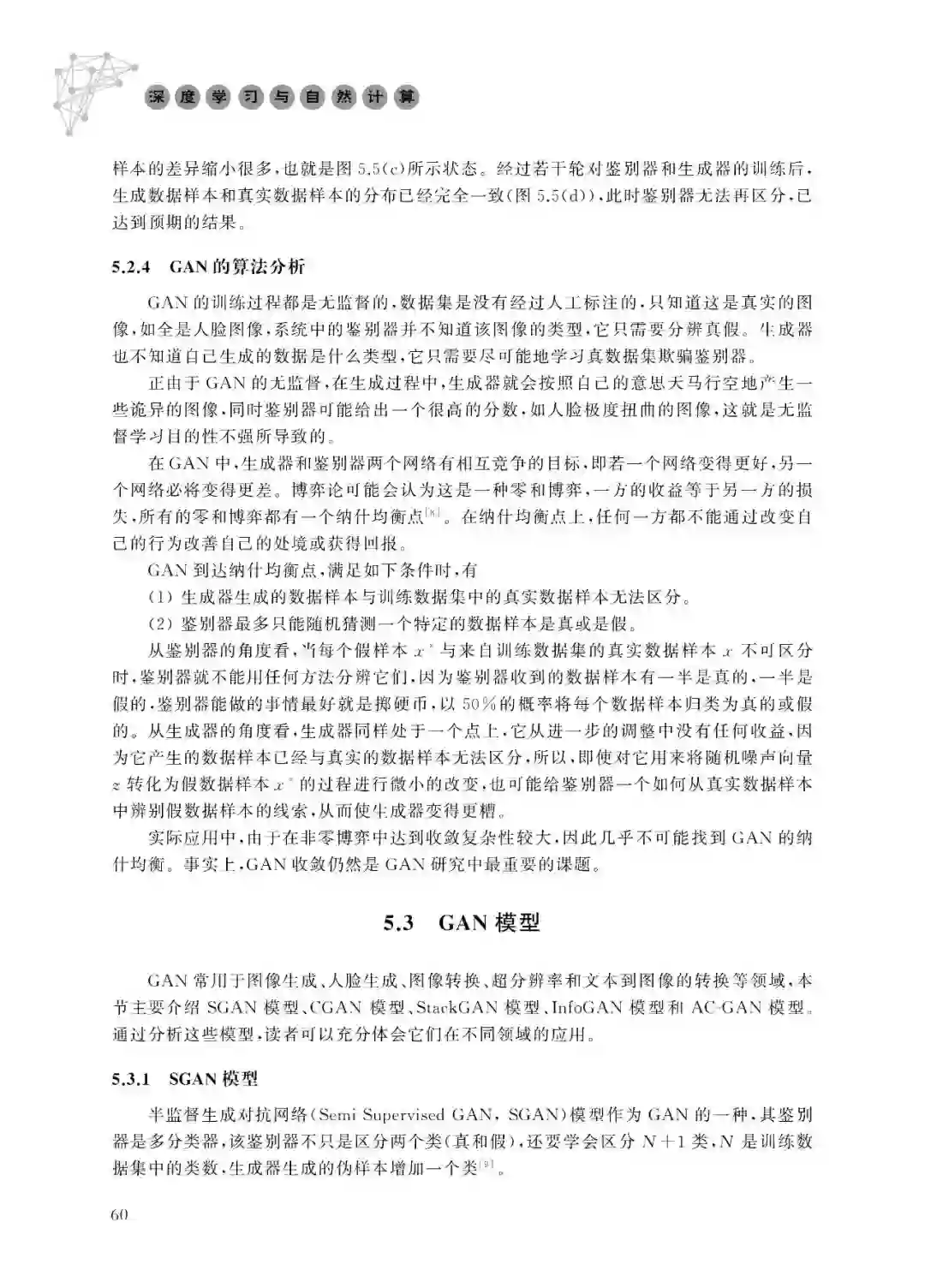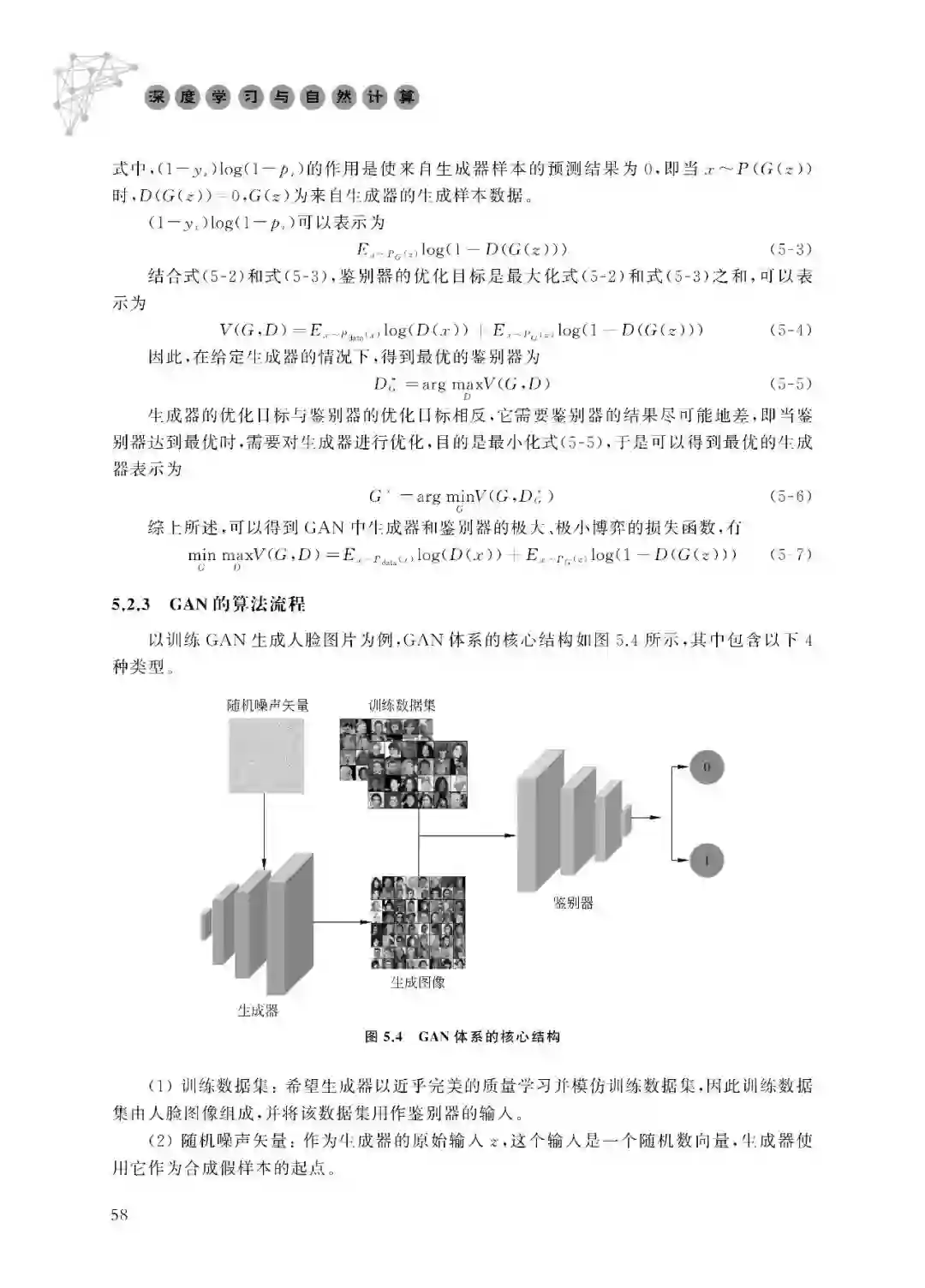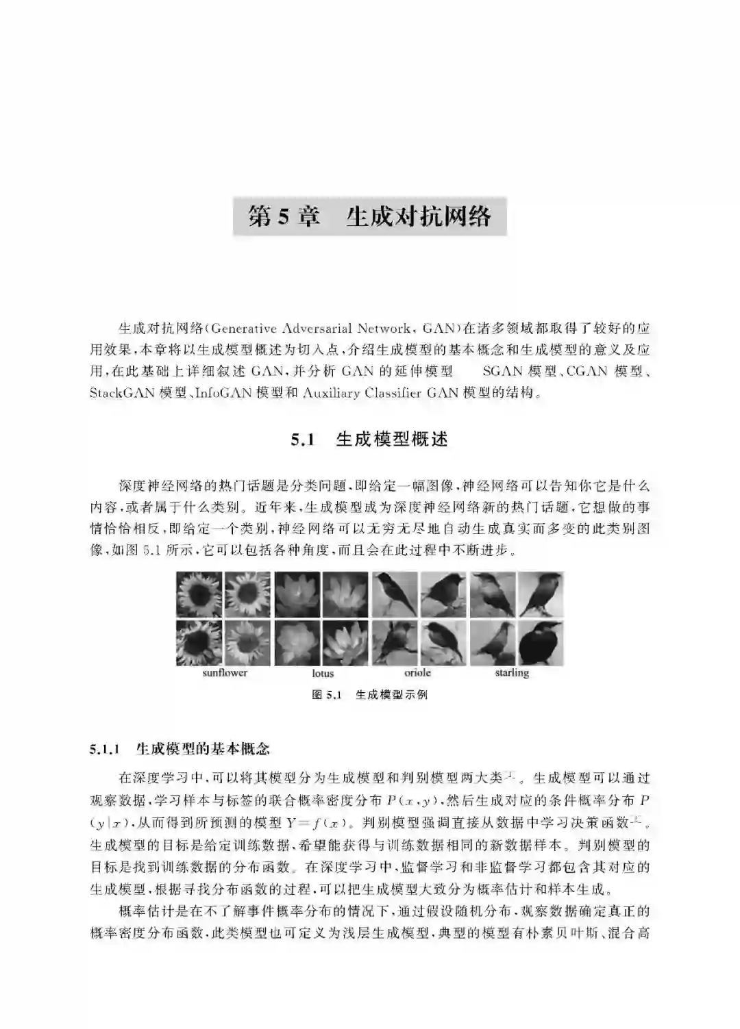 生成对抗网络(GenerativeAdversarialNetwork,GAN)在诸多领域都取得了较好的应 用效果,本章将以生成模型概述为切入点,介绍生成模型的基本概念和生成模型的意义及应 用,在此基础上详细叙述 GAN,并分析 GAN 的延伸模型———SGAN 模型、CGAN 模型、 StackGAN 模型、InfoGAN 模型和 AuxiliaryClassifierGAN 模型的结构。深度神经网络的热门话题是分类问题,即给定一幅图像,神经网络可以告知你它是什么 内容,或者属于什么类别。近年来,生成模型成为深度神经网络新的热门话题,它想做的事 情恰恰相反,即给定一个类别,神经网络可以无穷无尽地自动生成真实而多变的此类别图 像,如图5.1所示,它可以包括各种角度,而且会在此过程中不断进步。