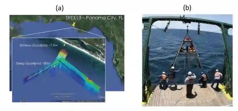 图 2:(a) 深层和浅层四脚架的位置,(b) 2013 年 4 月 20 日 12:40 左右(当地时间)从 R/V Smith 上将深层四脚架(近 3.3 米高)部署到水深约 20 米处。