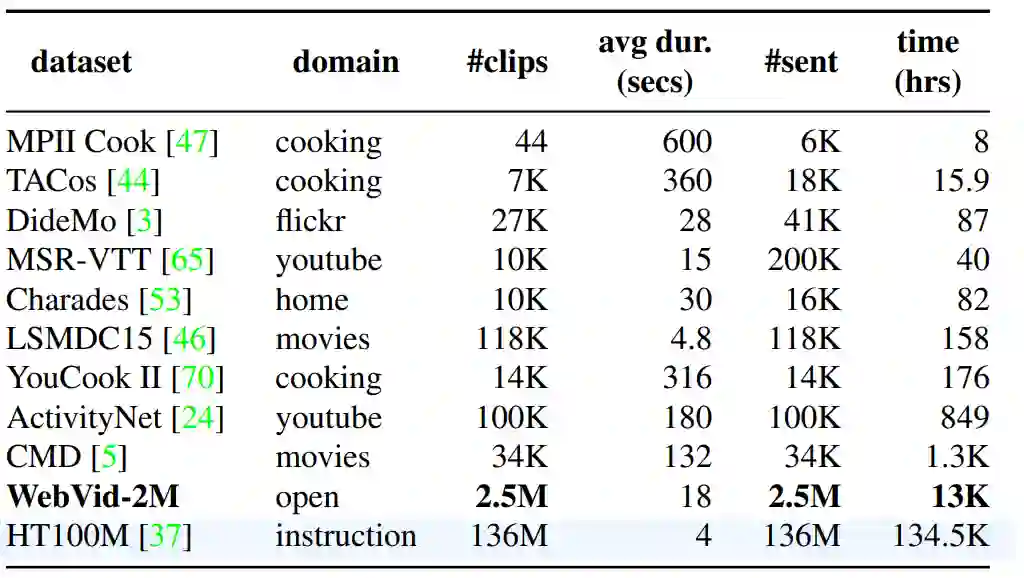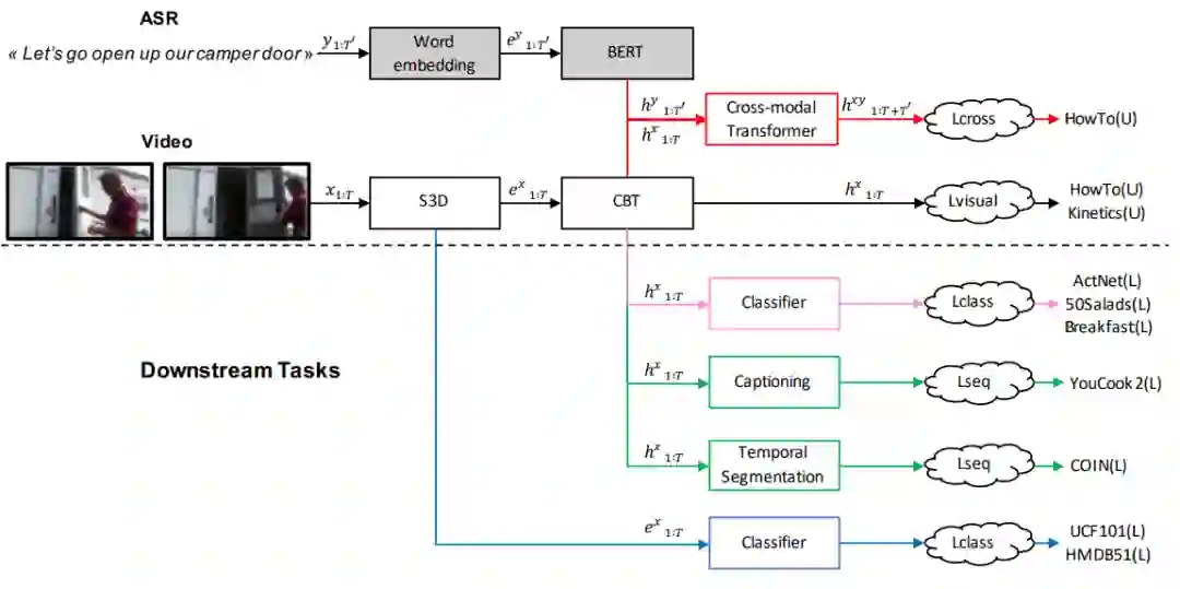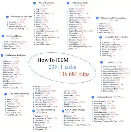 学习视频-文本的跨模态表示通常需要人工标注描述的的视频片段(clip),而标注一个这样的大规模数据集非常昂贵。Miech[1]等人发布了HowTo100M数据集,帮助模型从带有自动转写的旁白文本(automatically transcribed narrations)的视频数据中学习到跨模态的表示。HowTo100M从1.22M个带有旁白的教学(instructional)网络视频中裁切得到了136M个视频片段(clip)。视频的教学内容多由人类展示,包含了超过两万三千个不同的视觉任务。