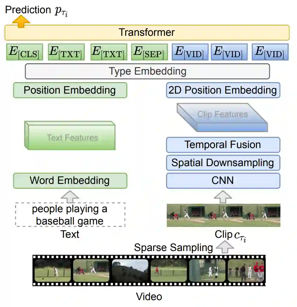 前人工作通常使用在不同领域预训练的视频编码器抽取得到的密集(dense)视频特征,ClipBERT[6] 利用了视频和图片之间的相似性,通过对视频进行稀疏(sparse)采样的方式对其进行编码,并实现了端到端的预训练。具体而言,研究人员随机采取多个视频片段(Clip),对于每个视频片段进行稀疏采样,以视频帧为单位进行编码得到表示;对于不同Clip不同帧的表示,可以进行时空上的信息融合,得到的表示将和文本编码共同输入到Transformer架构的编码器当中,如图5所示。以视频帧为单位进行编码,使得模型能够仅利用图片-文本数据集进行预训练(将图片看作只有一帧的视频),再在下游任务上利用视频进行训练。在预训练阶段,模型仅仅采用掩码语言建模,以及利用[CLS]标签进行视觉-文本匹配,来学习跨模态的表示。