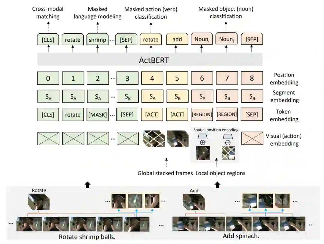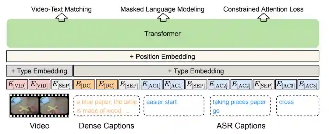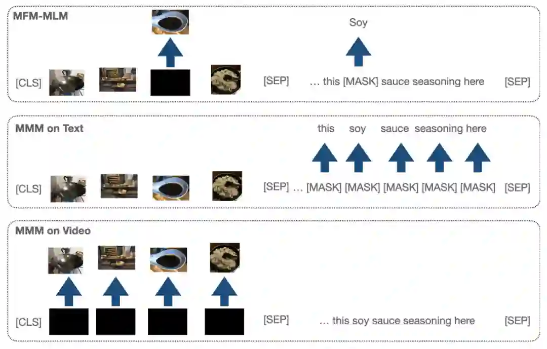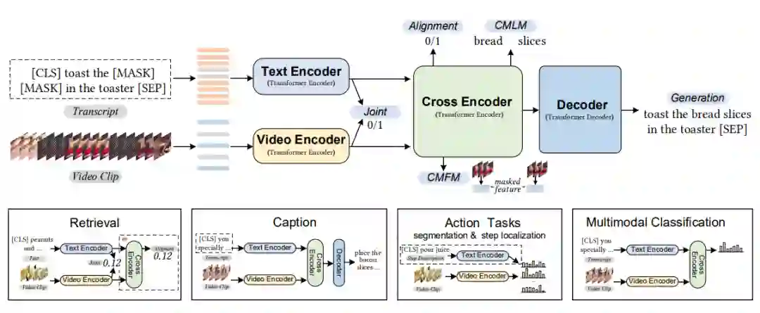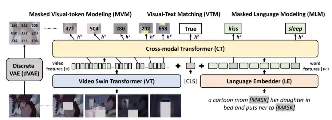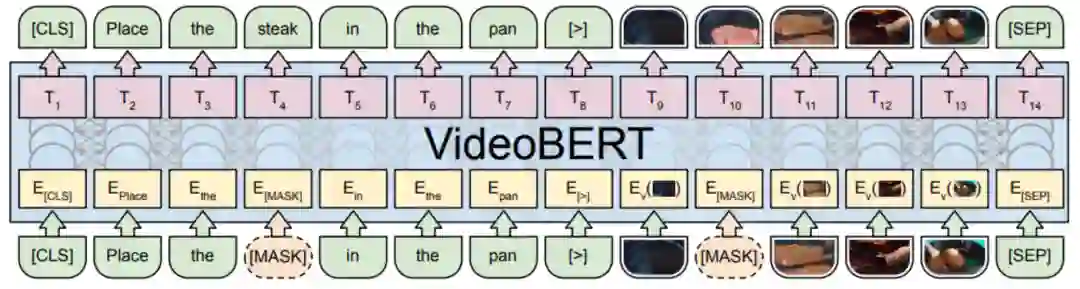 与BERT相似,VideoBERT引入了文本、视频两个模态的掩码完型任务(mask-completion),具体而言,就是利用上下文和跨模态信息恢复被[MASK]标签遮盖的视频/文本token。同时,为了建模跨模态之间的关联性,VideoBERT也利用[CLS]标签位置的编码判断视频和文本之间是否时序/语义对齐。