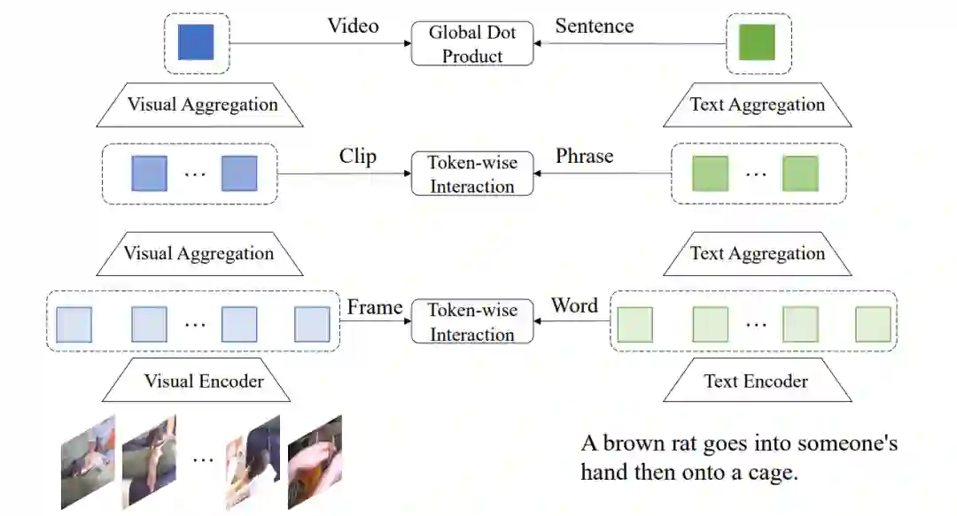 图18 HiT的模型架构[20]4.3.2 HunYuan_tvr 大部分的检索模型都聚焦于建立视频整体和整个对应文本之间的表示关系,HunYuan_tvr[21]从多个层次探究了细粒度表示的关系,通过建模帧-词语,视频片段-短语,视频-句子三个不同粒度跨模态表示之间的表示匹配,提出了层次化的跨模态交互方法来学习细粒度的跨模态联系,大致如图19所示。