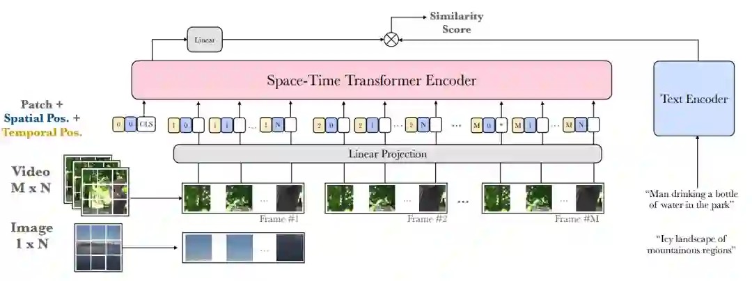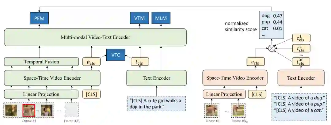 Fronzen[2]提出了一个专为检索任务设计的预训练框架。将图片看作视频的“快照”,将图文数据集作为视频数据集的一部分进行预训练,利用图文数据集增大了预训练的规模,同时利用视频-文本数据集学习关注视频内容中独有的时序信息。为了高效地进行跨模态检索,作者利用单模态的编码器编码两个模态的信息,并将两个模态的信息分别投影至一个共同的表示空间,计算其相似度。其架构大致如图9所示。视频以帧为单位进行输入,而图片则相当于仅包含一帧的视频,同时,模型也引入了space-time transformer[10]来建模视频中的时空信息。在预训练阶段,NCE同样被用作衡量训练的损失,模型交替利用视频数据和文本数据进行预训练。