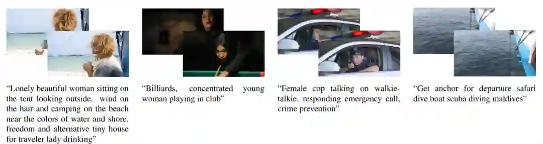 图2 数据集中视频-文本对的例子与之前的视频-文本配对数据集不同,HowTo100M数据集中的描述并不是人工标注的,由于旁白的特性,其与对应的视频clip在时序上可能并未对齐,同时也可能并不是完整的句子。但该数据集的规模足够庞大,为视频-文本预训练的工作进一步提供了可能。2.2 WebVidWebVid-2M[2]数据集包含了从网络上爬取的2.5M视频-文本数据对,与HowTo100M不同,WebVid中包含的视频数据来自于通用领域。WebVid数据集的构造方式和CC3M[3] 比较类似,研究者发现CC3M中超过10%的图片事实上都是视频的概览,通过找到原视频,研究者得以爬取2.5M的视频-文本对。图3展示了数据集中的一些样例,WebVid中的视频描述风格多样,包含精简亦或细节性的描述。