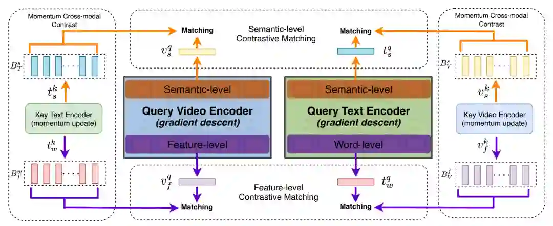 图17 BridgeFormer的模型架构[19]4.3 隐式细粒度特征 相比于考虑显式的细粒度特征,如时序、实体、动作等信息,也有部分工作认为除了视频、文本的整体表示,还可以考虑帧、patch级别的不同粒度表示,来隐式编码细粒度特征。 4.3.1 HiT 在Transformer架构中,不同的层将聚焦于不同粒度的表示信息, 例如较低层的注意力记住倾向于编码更加基础表面的表示,而更高层的注意力机制,将会捕捉更加复杂的语义信息,基于这样的想法,HiT[20]提出了分层跨模态的对比匹配机制,来建立不同粒度的跨模态表示对齐,具体而言,模型分别从视频、文本Query编码器的第一层和最后一层获得低层次特征级别和高层次语义级别的表示。并分别与另一模态的高层次编码结果进行表示匹配,如图18所示。