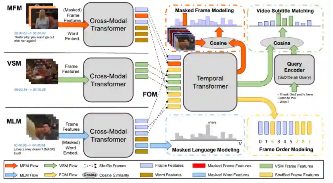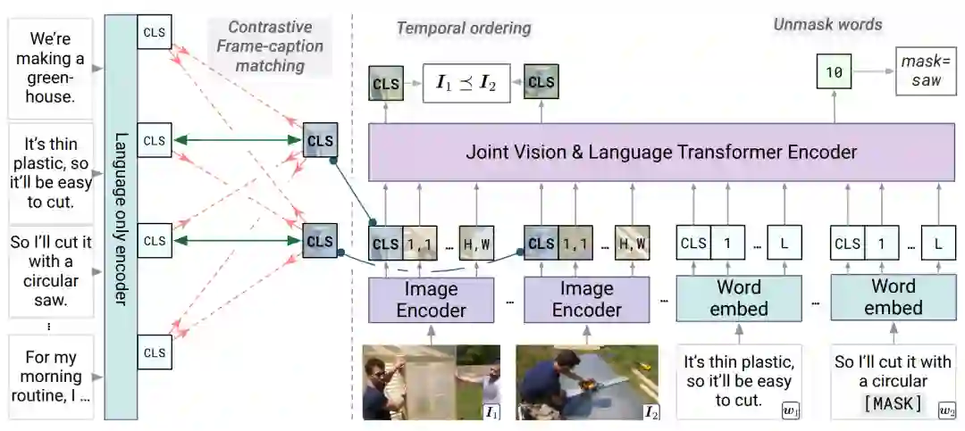 4.1.2 Merlot 包含密集视频描述(Dense caption)的视频内容通常包括丰富的跨模态时序对齐信息,Merlot[12]通过视频帧-描述匹配(Contrastive frame-transcript matching)来建模视频内部的时序信息。Merlot的输入是稀疏采样的视频帧,和视频帧对应的描述,模型通过最大化视频帧和对应描述的相似度,最小化和视频内其他帧视频描述相似度来建立视频和文本之间的时序对齐信息;与HERO不同,Merlot利用时序重排序(Temporal Reordering)任务,按比例打乱视频帧的顺序,并判断帧之间的相对顺序来指导模型关注视频内部的时序信息。