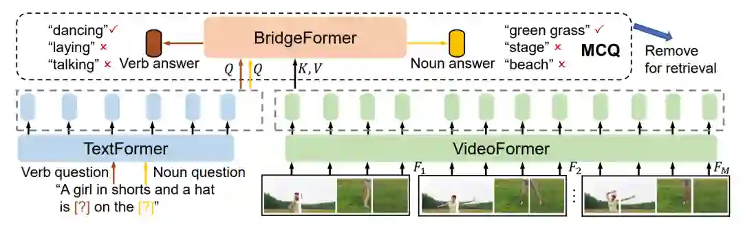 图16 ALPRO的模型架构[17] 4.2.4 BridgeFormer 相比于利用物体检测的信息,BridgeFormer[19]利用多项选择任务(Multiple Choice Questions)来增强模型对视频中实体新信息和动作信息的理解。具体而言,研究人员从原始文本中遮盖动词或名词短语来构建“问题”,将文本编码器得到的问题表示作为跨模态Transformer的查询(Query),将视频内容编码表示作为键(Key)和键值(Value),即将跨模态表示问题形式化为了给定问题,从视频中进行查询,获得答案的过程,在应用于下游任务时,单模态编码器已经学习如何建立到了细粒度的表示跨模态模块可以被去除。